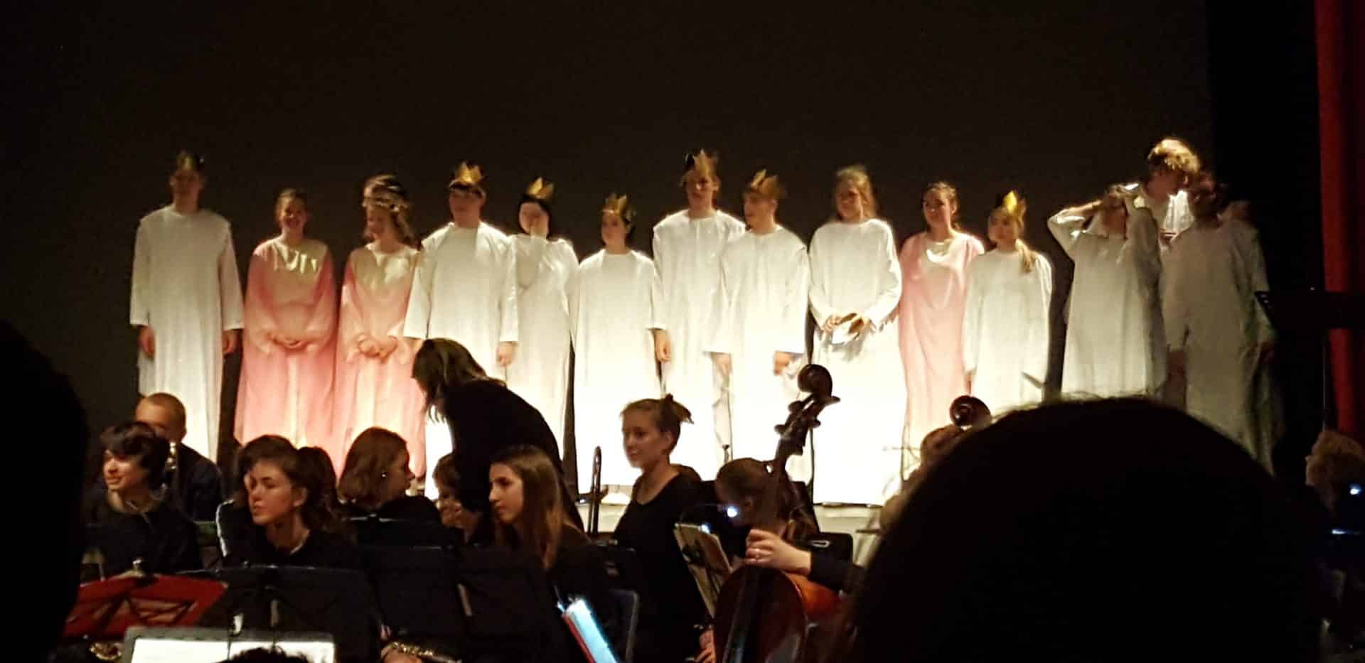 8. 9. 10. 11. og 12. klasserne havde taget hele deres overskole orkester med. Der var både violin, cello og kontrabas. Tværfløjte, obo, klarinet, trombone, trompet og fransk horn. Træ- og metalxylofon, pauker og stortromme.