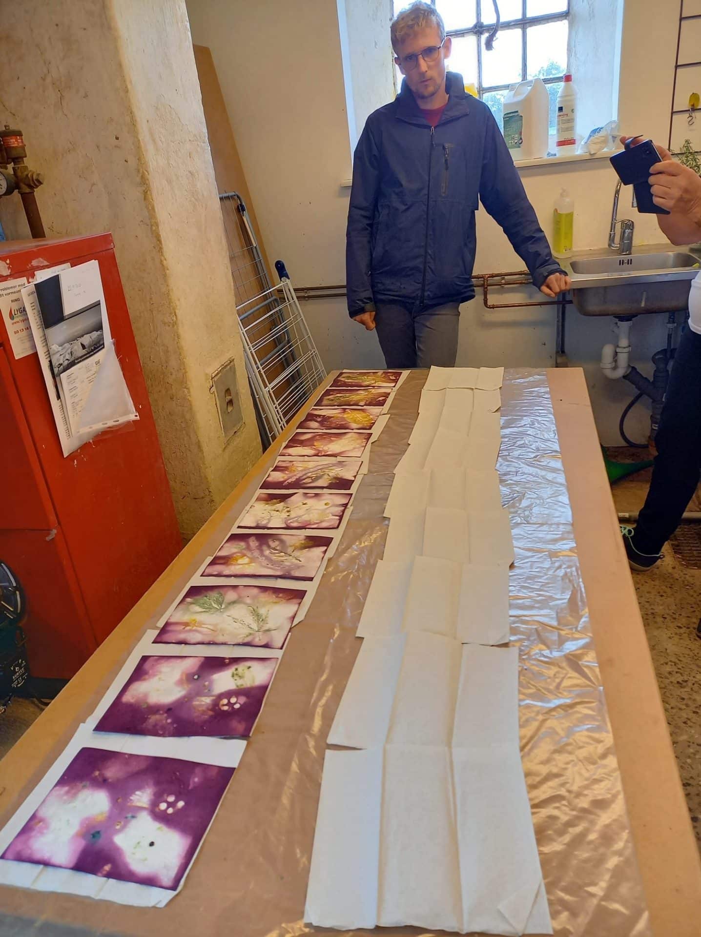 Dagen efter blev de tørre tryk strøget og klippet til, så de kunne sættes i rammer, på et kort mm. Vi sluttede dagen af med kaffe og kage, og et tilbageblik på hvordan dagen havde været.