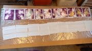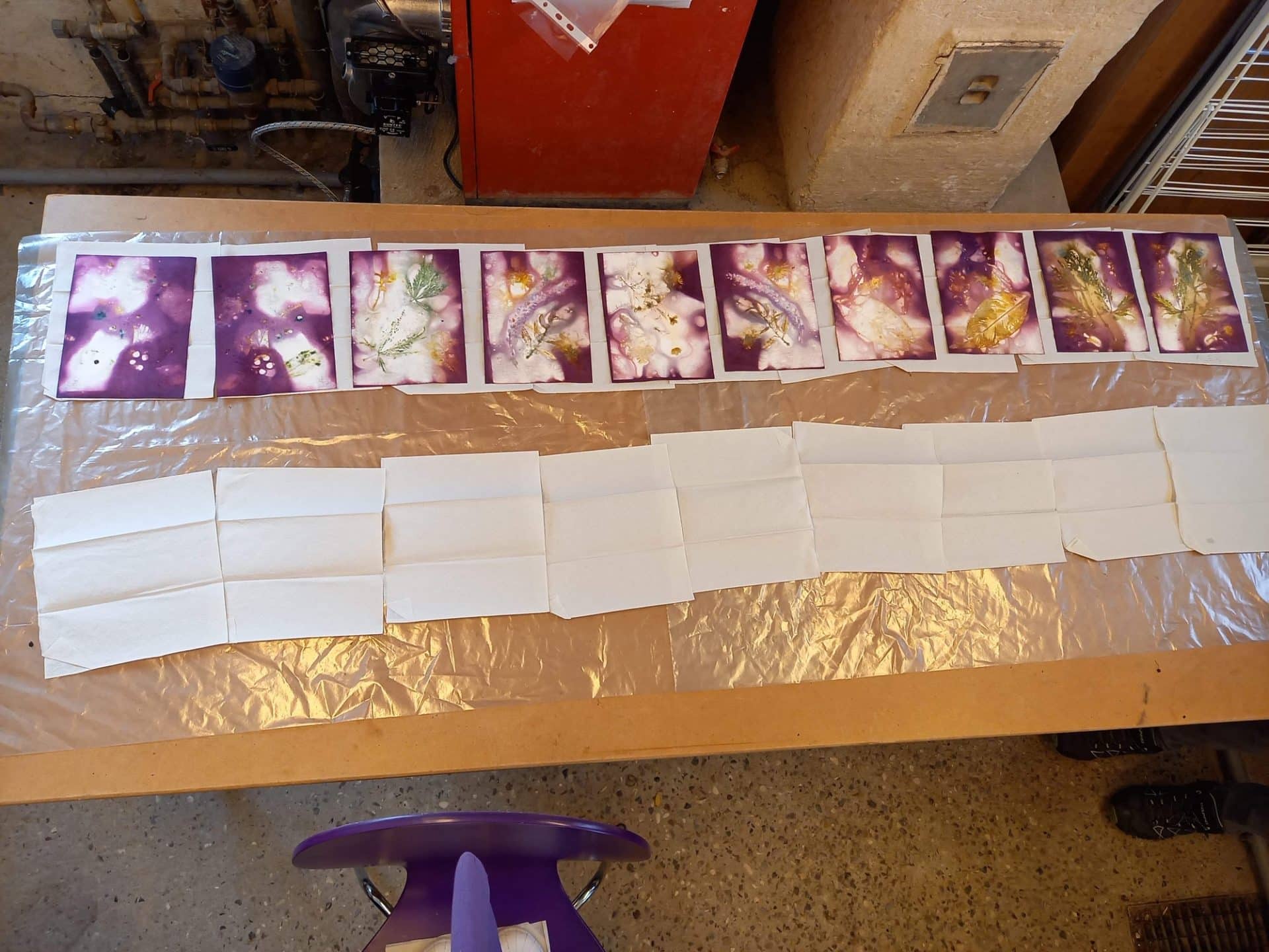 Da stakkene var kogt, skulle de pakkes ud. Her kom de mest fantastiske tryk af blomster og blade frem og de vakte stor begejstring. Alle tryk blev lagt til tørring til næste dag.