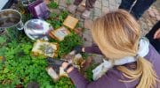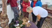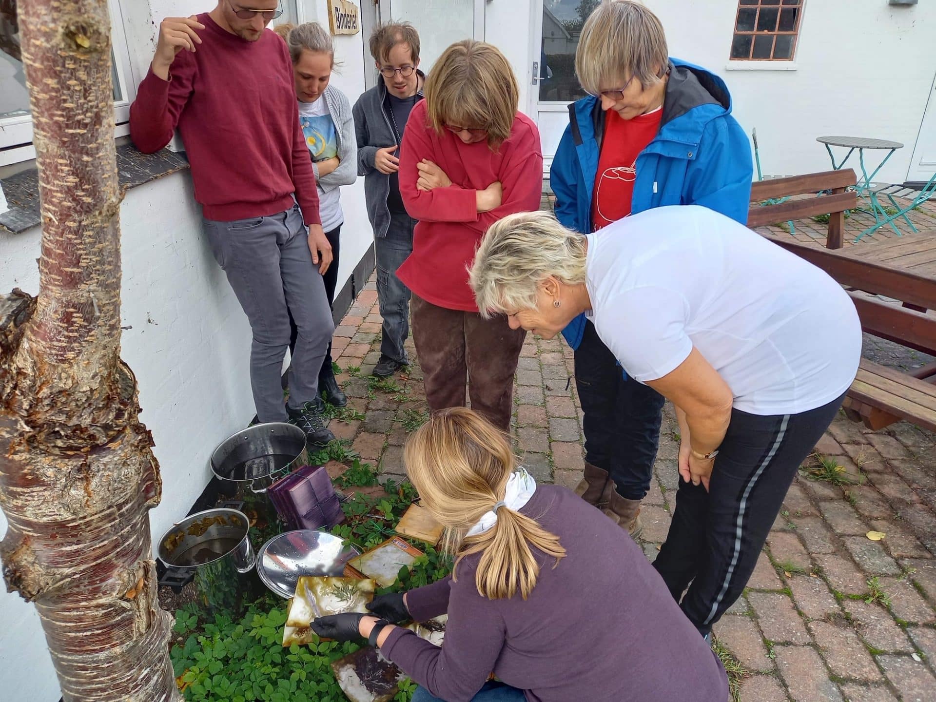 Glade og forventningsfulde beboer havde meldt sig. Vi startede ud med at samle blomster og blade ude i naturen, og tog dem med ind i Binderiet. Her lagde vi planterne på akvarelpapir og fik hver en lille stak, som vi så kogte i en gryde. – Lise og Anne Marie var så søde at lade os bruge deres kogeplader og imens stakken kogte, kunne vi spise vores medbragte frokost.