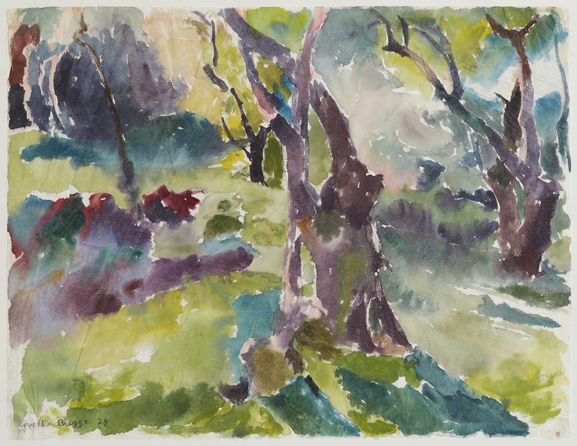 - Uden titel (i skoven), 1974. Akvarel på japanpapir, 46 x 67 cm